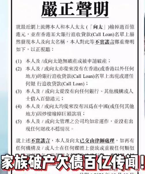 而关于“炒楼失败欠债百亿”的最新传闻,起源于向佐140万港元的担保债务纠纷,随后被放大为“百亿亏空、银行追债”的惊悚叙事 。